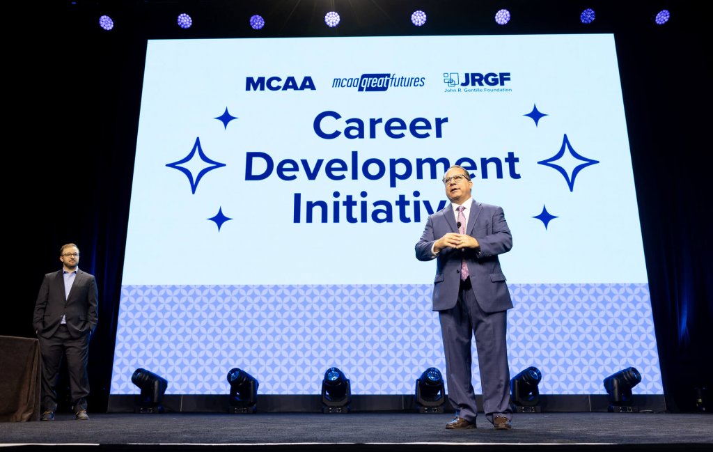 Later in the awards ceremony, Robert shared the stage with Andrew Palcan, MCAA Career Development Committee Chair, who received this same scholarship from Robert Beck eight years ago, also in Orlando. The stage was certainly full of excitement and pride during this award!