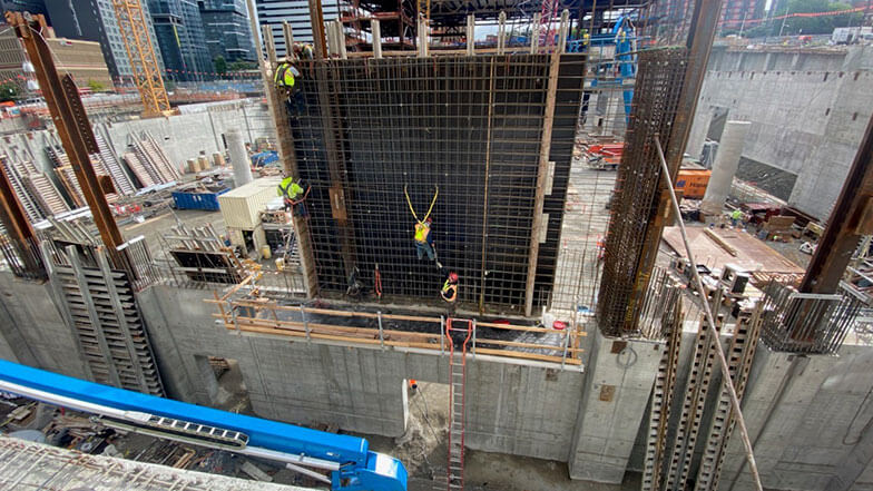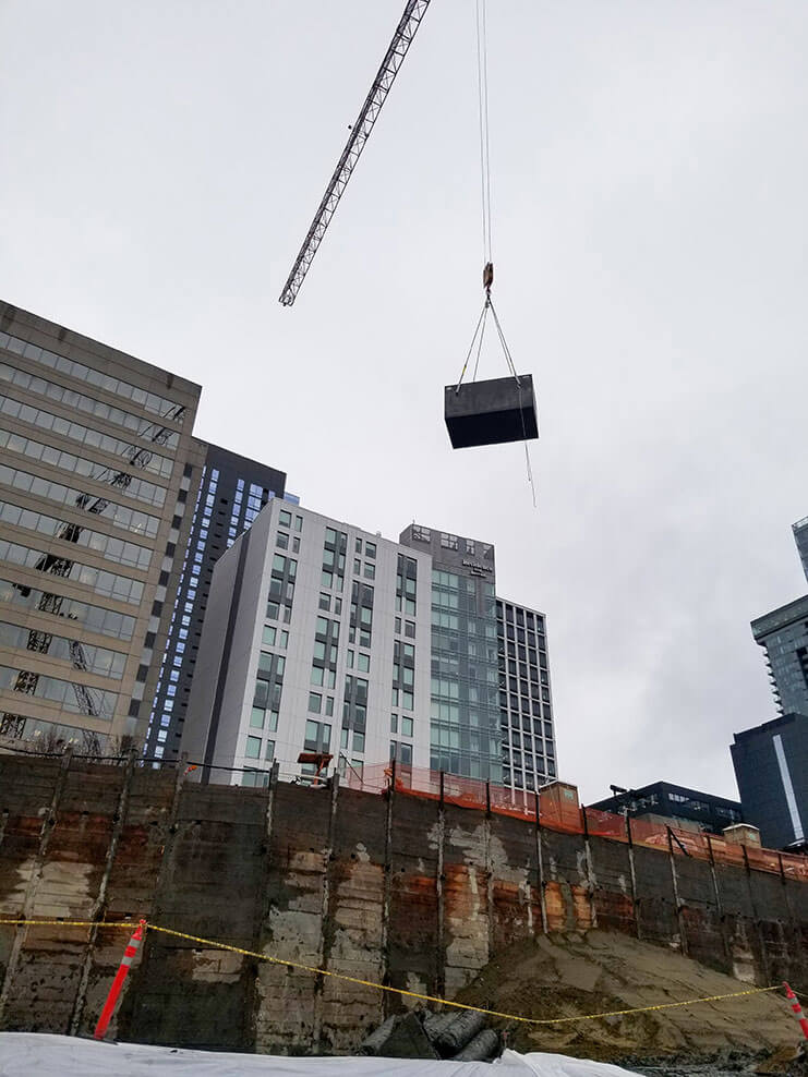 The convention center is being erected using “billboard construction” methodologies, a technique that is somewhat unique to Seattle-area construction. This technique involves building vertical sections simultaneously instead of floor-by-floor and creates greater efficiencies on sites with limited laydown area.