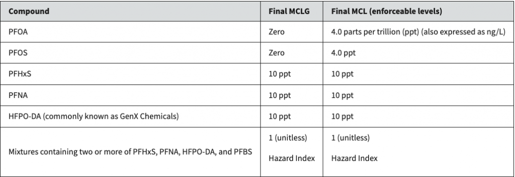 The final rule establishes MCLs for six PFAS in drinking water, “PFOA, PFOS, PFHxS, PFNA, and HFPO-DA as contaminants with individual MCLs, and PFAS mixtures containing at least two or more of PFHxS, PFNA, HFPO-DA, and PFBS using a Hazard Index MCL to account for the combined and co-occurring levels of these PFAS in drinking water. EPA also finalized health-based, non-enforceable Maximum Contaminant Level Goals (MCLGs) for these PFAS.”