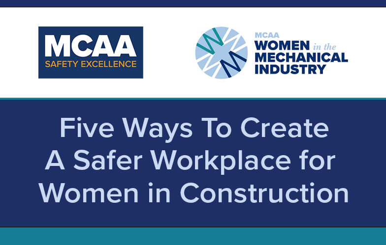Over 390,000 women work in the construction industry, up significantly over the past decade. Despite this tremendous growth, many women still face challenges, including safety and health. All workers deserve a safe workplace and to return home at the end of the day in the same shape as when they got there. MCAA’s Safety Excellence and Women in the Mechanical Industry initiatives are pleased to bring you these tips for creating safer workplaces for women.