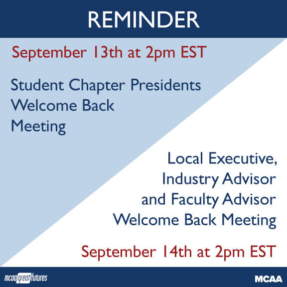 On Sept 13th and 14th at 2pm EST MCAA’s Career Development Committee will be hosting welcome back meetings for all involved in an MCAA student chapter.