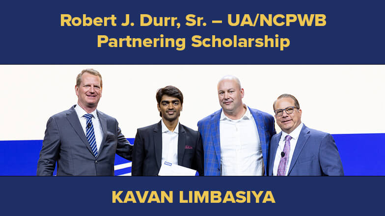 Congratulations to Kavan Limbasiya, the recipient of the Robert J. Durr, Sr. – UA/NCPWB Partnering Scholarship, which is in honor of Robert J. Durr, Sr., former chairman of the National Certified Pipe Welding Bureau Board of Trustees, for his effort and dedication in creating a partnership between the UA and the NCPWB, which resulted in the formation of the Joint Welder Testing Program.
