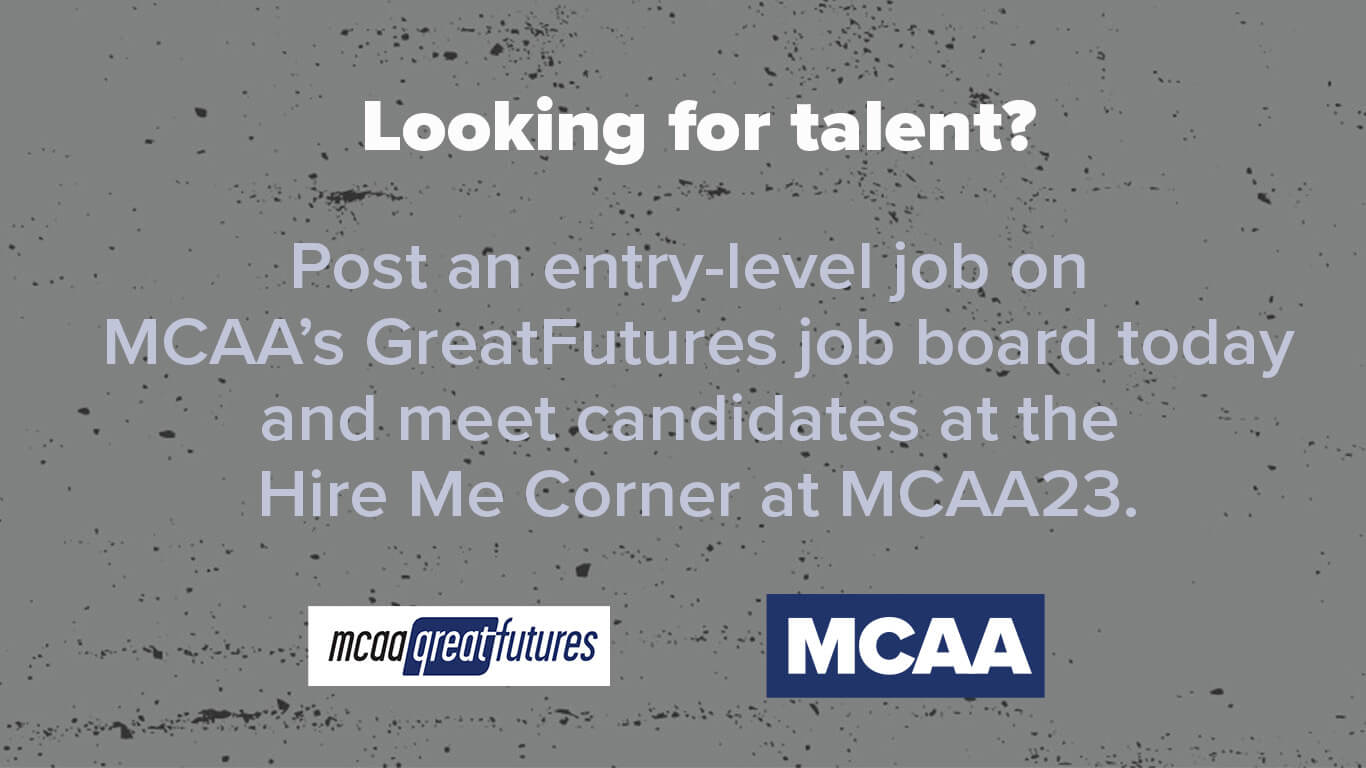 Over 125 Students from close to 30 chapters are registered for MCAA23. They will soon be scoping out MCAA’s GreatFutures Job Board for companies they would like to meet with in Phoenix to discuss internships and entry-level full-time positions. Post your position(s) today and be sure to stop by the Hire Me Corner (inside the Manufacturer/Supplier Council Exhibit) on Tuesday, March 28th to meet students in person.