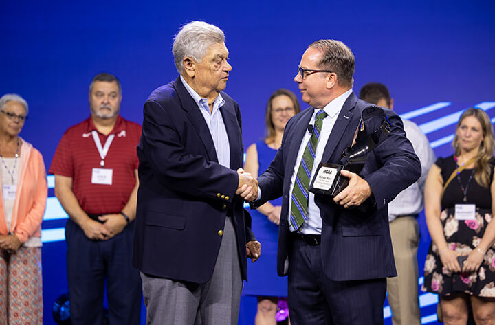 This year MCAA presented its highest award, the Distinguished Service Award, to Michael Mack. The DSA award celebrates a legacy of service and dedication to improving the mechanical contracting industry. During Mack’s career, he played a pivotal role in redeveloping MCAA’s Institute for Project Management, advancing its mission and dedicating years to its progress. Mack’s family joined him onstage at the opening general session of MCAA24 for the surprise.