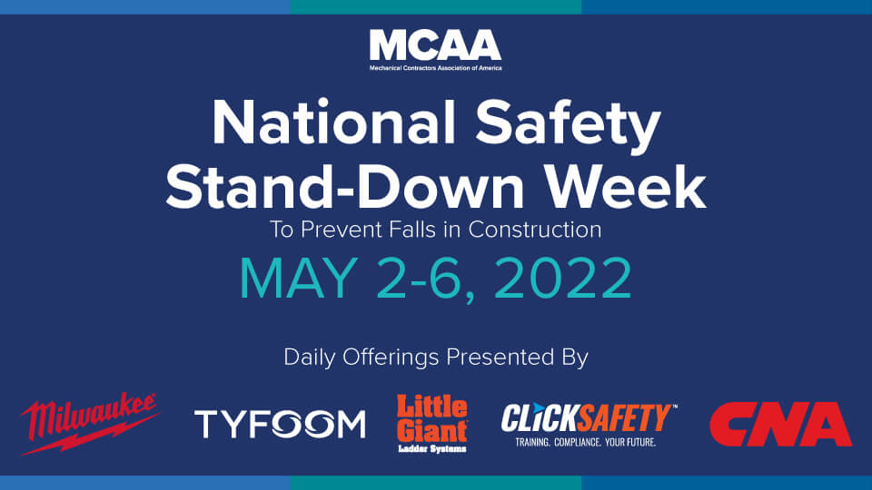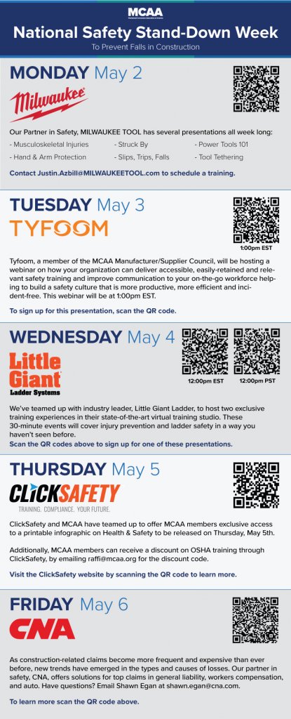 We are two weeks away from National Safety Stand-Down to Prevent Falls in Construction. Register now for MCAA’s daily offerings.