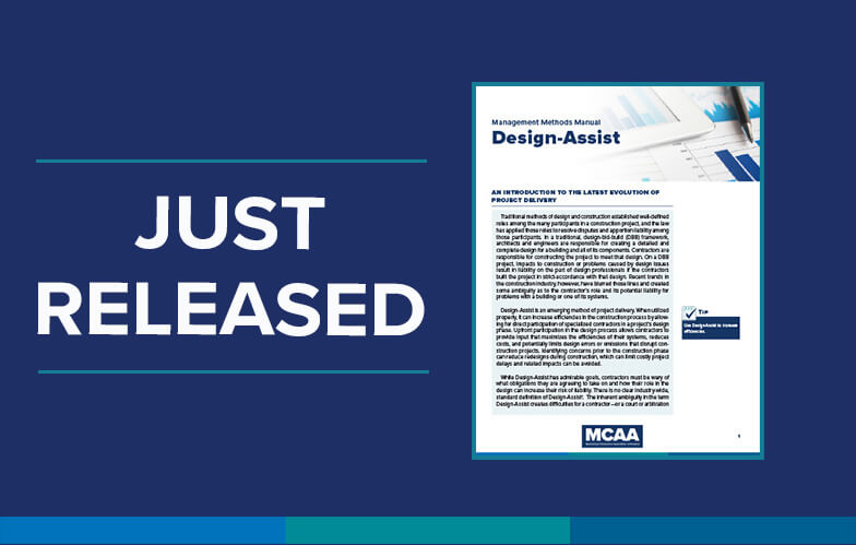 On a Design-Assist project, specialty contractors participate in a project’s design. They can provide input that maximizes system efficiencies, reduces costs, and potentially limits design errors or omissions. While the process has many benefits, it also presents risks that are not inherent in other forms of delivery. MCAA’s new Design-Assist bulletin offers tips for mitigating those risks. It’s just one of MCAA’s educational resources that are free to MCAA members as a benefit of membership.