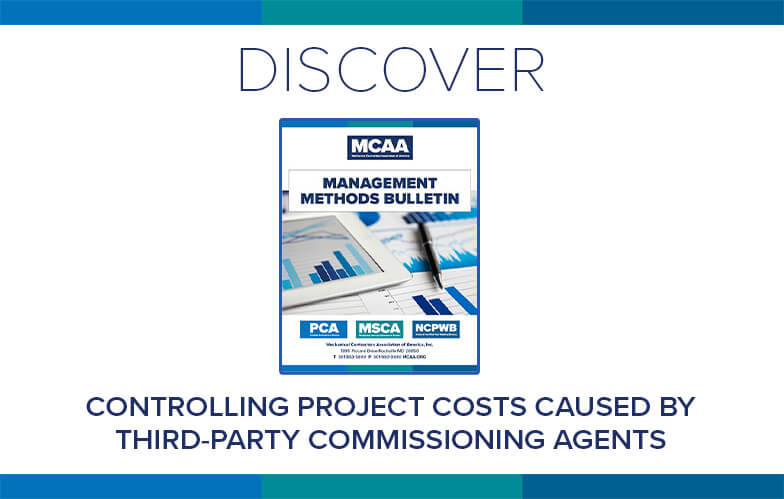Mechanical contractors have been subject to scope-of-work creep by third party commissioning agents that require activities beyond the bid scope and project design. MCAA’s Controlling Project Costs Caused by Third-Party Commissioning Agents offers tips to help contractors minimize the potential for scope creep and the resulting cost increases and schedule impacts. It’s just one of MCAA’s educational resources that are free to MCAA members as a benefit of membership.