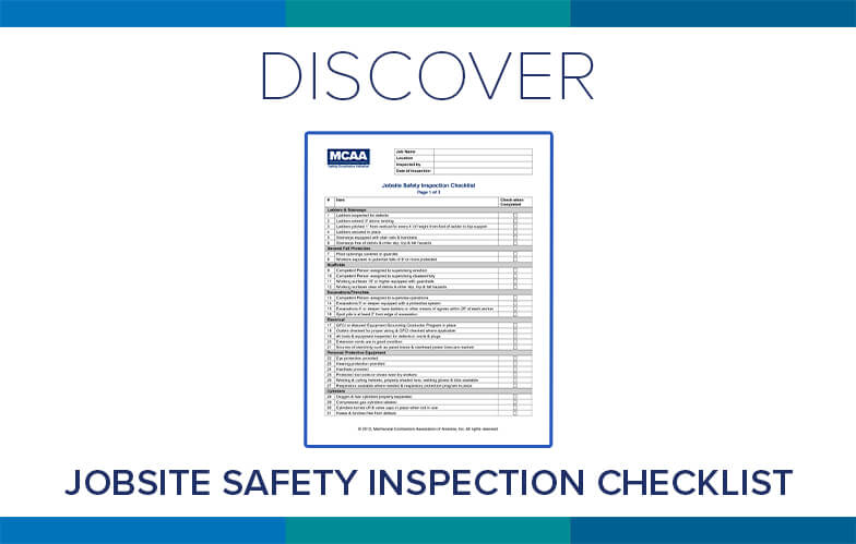 Each week, MCAA will highlight one or more of the educational resources that are free to MCAA members as a benefit of membership. This week, we focus on MCAA’s Jobsite Safety Inspection Checklist. This checklist can be easily customized to help keep you organized and on track when you perform safety inspections.