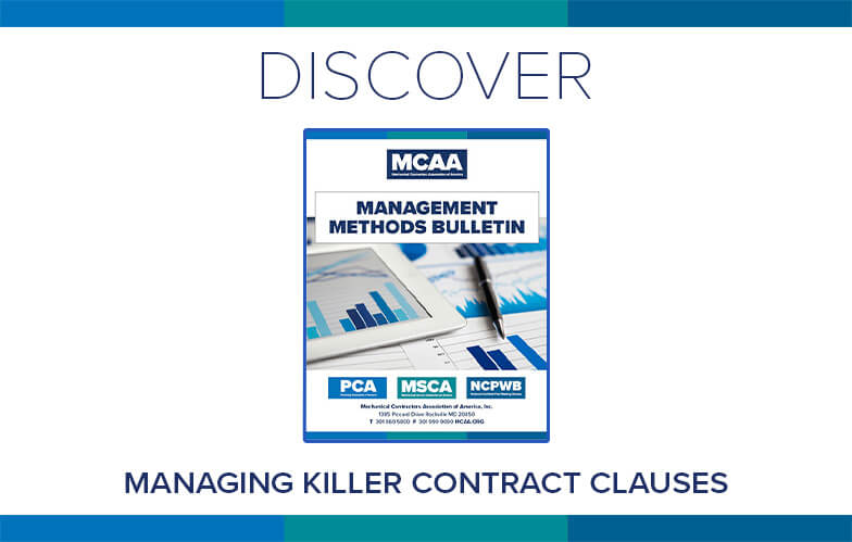 Savvy mechanical contractors pay strict attention to the language in standard, preprinted contract forms and make modifications to protect themselves. MCAA’s Managing Killer Contract Clauses provides examples of killer contract clauses and suggestions for modifying the language to eliminate unnecessary risk. It’s just one of MCAA’s educational resources that are free to MCAA members as a benefit of membership.