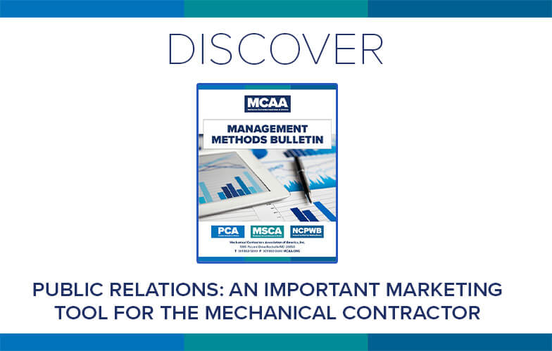 Heightened competition has spurred mechanical contractors to share their impressive story of accomplishment, capabilities and convictions to bolster their image and competitive advantage. MCAA’s Public Relations: An Important Marketing Tool for the Mechanical Contractor highlights the need for regular promotion as a business development tool and offers tips for selecting a public relations consultant. It’s just one of MCAA’s educational resources that are free to MCAA members as a benefit of membership.