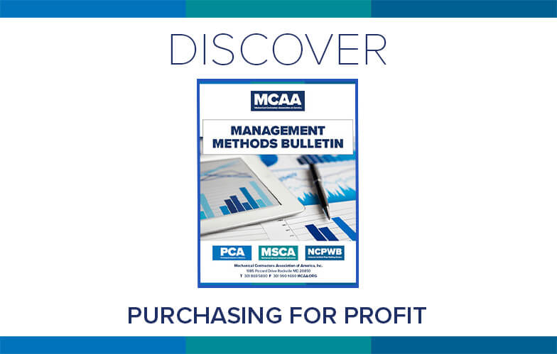 Mechanical contractors looking to eliminate or reduce risk may want to adopt more strict and formal policies regarding the issuance of purchase orders. MCAA’s Purchasing for Profit is designed to help you establish purchasing techniques that help protect your business and purchases. It’s just one of MCAA’s educational resources that are free to MCAA members as a benefit of membership.
