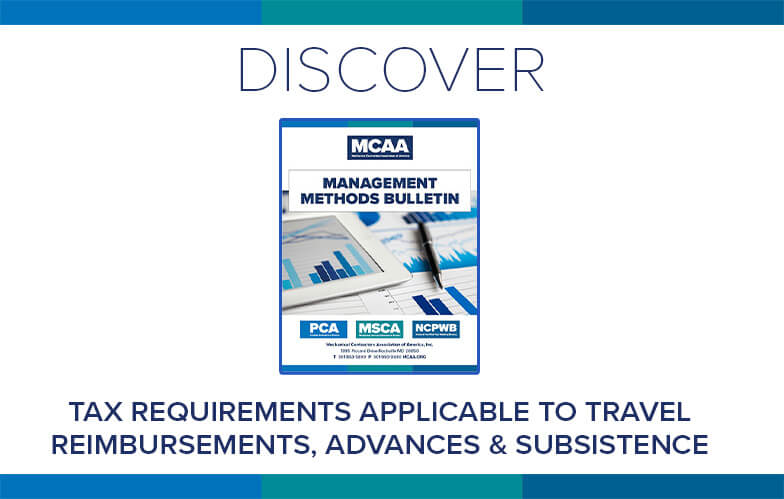 Mechanical contractors must satisfy federal employment tax requirements with respect to all “wages” paid to employees. MCAA’s Tax Requirements Applicable to Travel Reimbursements, Advances and Subsistence Allowances explains the tax rules and addresses the related question of the employer’s right to deduct these payments as ordinary and necessary business expenses. It’s just one of MCAA’s educational resources that are free to MCAA members as a benefit of membership.