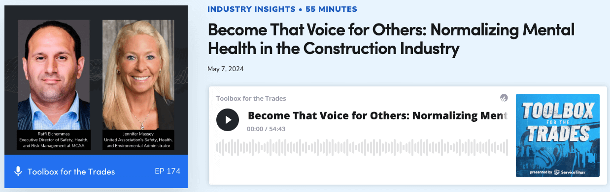Mental health awareness and suicide prevention are a priority across the construction and service industries. MCAA member ServiceTitan recently amplified the conversation with a special episode of its ‘Toolbox for the Trades’ podcast. The hour-long podcast, hosted by Jackie Aubel, features a dialogue between the United Association’s (UA) Jennifer Massey and MCAA’s Raffi Elchemmas.