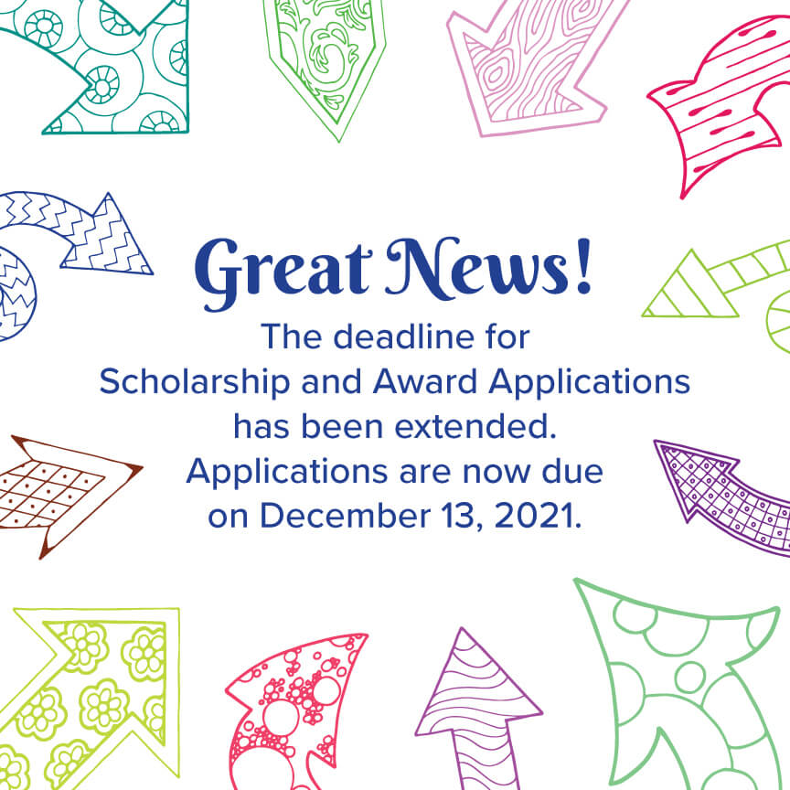 Deadline Extended: Students, we know you are busy. We have extended the deadline to submit your completed scholarship and award applications. All scholarship & award applications are now due, Monday, December 13th.