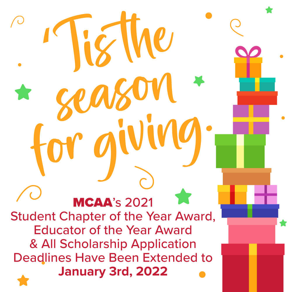 Tis the season to be giving. MCAA’s Career Development Committee is giving students another few weeks to submit applications for scholarships and annual awards! Applications for scholarships, MCAA’s 2021 Student Chapter of the Year, and MCAA’s 2021 Educator of the Year are now due Monday, January 3rd, 2022.