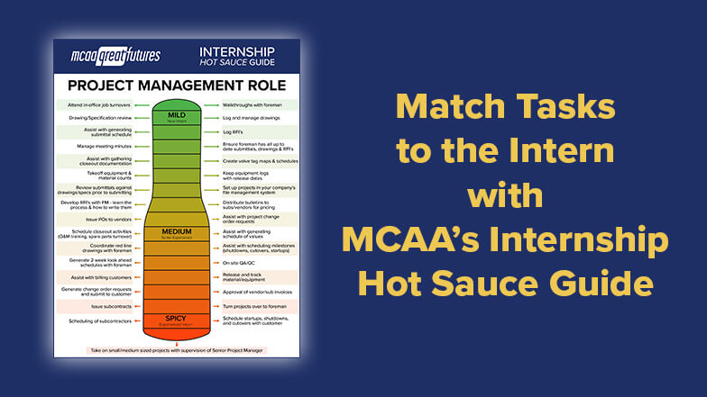 The start of summer is almost here and a fresh batch of interns will soon be flowing through the doors of mechanical contracting companies across the country. You have hired your interns, but now what do you do with them? MCAA’s Internship Hot Sauce Guide answers this question with a visual display of intern-level tasks, classified by level of industry experience.